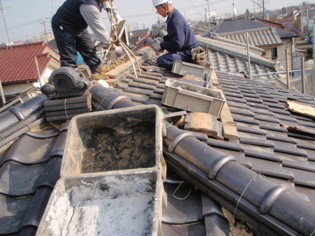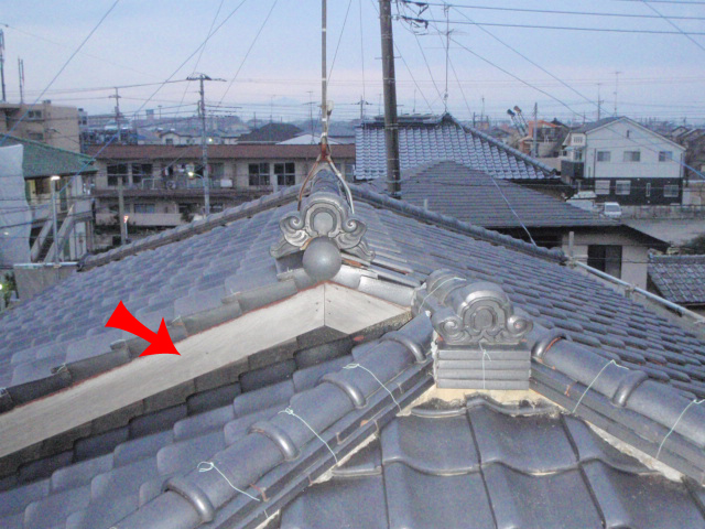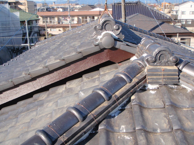 棟の瓦を積み換えて新規で漆喰の工事を行いました。