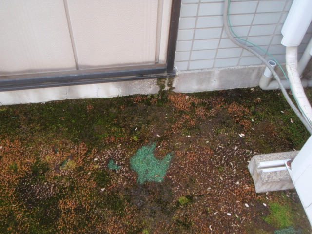 人工芝の中に土が溜まってしまいコケが生えていました。