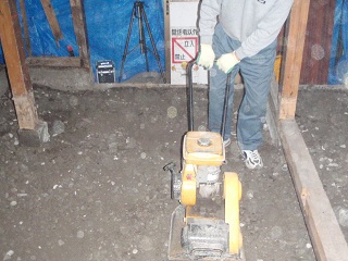 RC40という砕石を敷き詰め、プレートで押さえて転圧していきます。