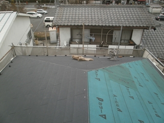 木材の上に屋根になる材料を施工します。